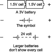 由化學物質產生電壓的單個單元稱為“電池”。如果我們想要更高的電壓,我們必須串聯電池,然后我們有一組電池或“電池組”,我們現在簡稱為“電池”。因此,嚴格來說,在購買時,我們不應該要求 1.5 V 電池,而是要求 1.5 V 電池,但這往往會造成比其價值更多的混亂(見圖 12.11)。