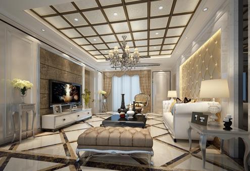 客廳吊頂采用網(wǎng)格形式設(shè)計,與地面大理石瓷磚呈呼應(yīng)之態(tài)。線條感極強(qiáng),干凈利落。不銹鋼線條吊頂在嵌入的筒燈照射下,為整個家居空間增添了一絲清冷的硬朗氣質(zhì)。