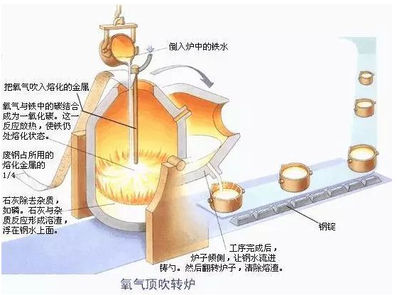 生鐵中的各種雜質(zhì),在高溫環(huán)境下,不同程度上都與氧有較大的親和力。因此可以利用氧化的方法使它們成為液體、固體或氣體氧化物,液體和固體氧化物在高溫下與爐襯和加入爐內(nèi)的熔劑進(jìn)行反應(yīng),結(jié)合成爐渣,并在扒渣時(shí)被排除爐外,氣體也在鋼水沸騰時(shí)被CO帶到爐外。