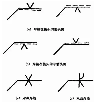 基本符號相對基準(zhǔn)線的位置見圖1—27(a)、(b)、(c)、(d);標(biāo)注對稱焊縫及雙面焊縫時,不加虛線。