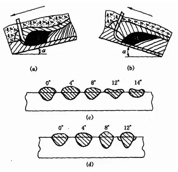 圖1—32??電極(焊絲)傾角對焊縫形狀的影響