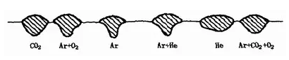 (6)保護(hù)氣體成分??氣體保護(hù)焊時,保護(hù)氣體的成分以及與此密切相關(guān)的熔滴過渡形式對焊縫形狀有明顯影響。采用不同保護(hù)氣體進(jìn)行熔化極氣體保護(hù)焊直流反接時,焊縫形狀的變化,見圖1—35。射流過渡氬弧焊總是形成明顯蘑菇狀焊縫,氬氣中加入O2、CO2或H2時,可使根部成形展寬,焊縫厚度略有增加。顆粒狀和短路過渡電弧焊則形成的焊縫形狀寬而淺。