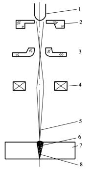 電子束焊接的定義 2019-07-0510:39:01電子束焊接的定義已關(guān)閉評論電子束焊接方法(圖4.3.5)屬于高能密度焊接方法。其特點是焊接時的能量密度大,可以焊出寬度小、深度大的焊縫,熱影響區(qū)以及焊接變形很小。電子束焊在真空中進行,焊縫受到充分保護,能保證焊縫金屬的高純度。電子束焊以前多用于航空航天、核工業(yè)等部門,焊接活性材料及難熔材料。現(xiàn)已應(yīng)用在汽車制造、工具制造等工業(yè),如焊接汽車大梁及雙金屬鋸條等。圖4.3.5 電子束焊原理1—陰極 2—控制板 3—陽極4—電磁透鏡 5—電子束6—聚焦束 7—工件 8—焊縫 贊 0 分享