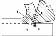 切削過程中,變形抗力和摩擦阻力所消耗的功絕大部分都轉(zhuǎn)變?yōu)闊崮芊Q為切削熱。切削熱來源于3個變形區(qū)。如圖5.1.24所示,在第一變形區(qū)內(nèi),由于切削層金屬發(fā)生彈性變形和塑性變形而產(chǎn)生大量的熱量;在第二變形區(qū)內(nèi),由于切屑與前刀面摩擦而產(chǎn)生熱量;在第三變形區(qū)內(nèi),由于工件與后刀面摩擦而產(chǎn)生熱量。切削塑性金屬時,切削熱主要來自Ⅰ、Ⅱ變形區(qū);切削脆性金屬時,切削熱主要來自Ⅰ、Ⅲ變形區(qū)。