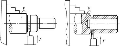 ①對于短軸和小套,可在一次裝夾中車出各加工面,然后切斷,如圖5.2.3所示。由于各加工表面具有同一回轉(zhuǎn)軸線,能保證各外圓與內(nèi)圓的同軸度要求,端面對軸線的垂直度或端面圓跳動要求。