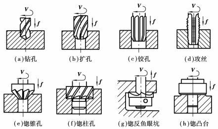 用锪鉆在已有的孔上锪出錐形或柱形的沉坑稱為锪孔;用锪刀加工孔端凸臺稱為锪凸臺。锪孔和锪凸臺多在鉆床上進行,如圖5.2.22(e)~(h)所示。它們雖不及鉆、擴、鉸用得普遍,但也是一種不可缺少的加工方法。